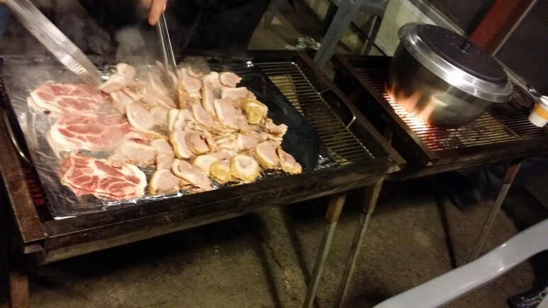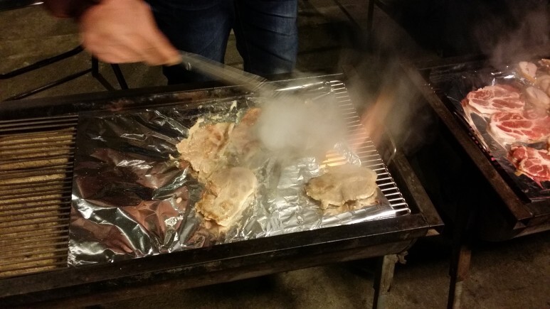 생목살과 훈제오리고기를 바베큐 참숯위에 올려놓고 굽는데,,,