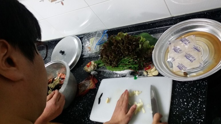 대구탕 패키지를 풀고,,, 팬션에 비치되어 있는 솥단지에 마늘을 추가로 첨가했습니다.